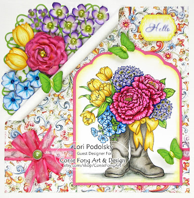 Hello! Last week I posted a beautiful image by Conie Fong called "Garden Bouquet" which has gorgeous flowers in a watering can. This time, I am sharing my GD card featuring Conie Fong's fabulous image called "Bootiful Bouquet" which has gorgeous flowers in garden boots. You can find this lovely image here: https://www.etsy.com/listing/594284066/digital-stamp-digi-stamp-digistamp-conie?ref=shop_home_active_2